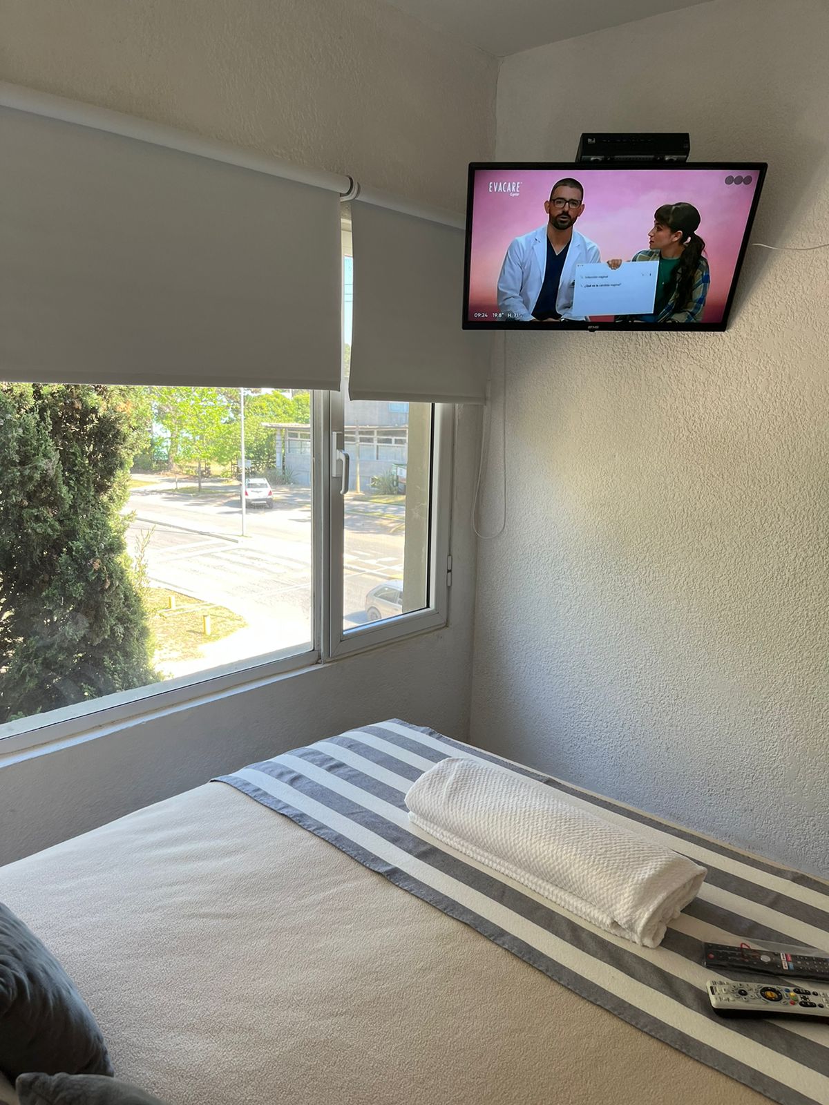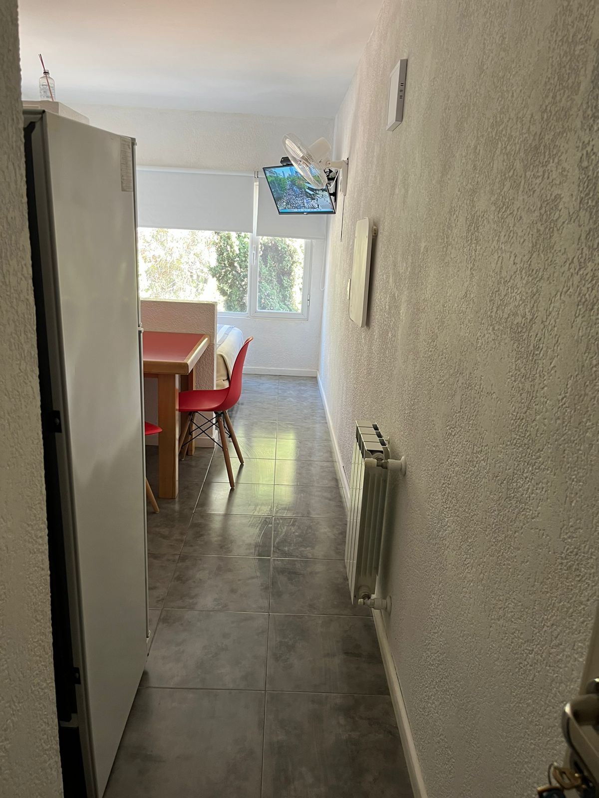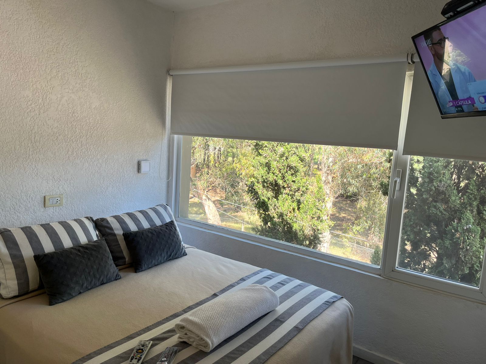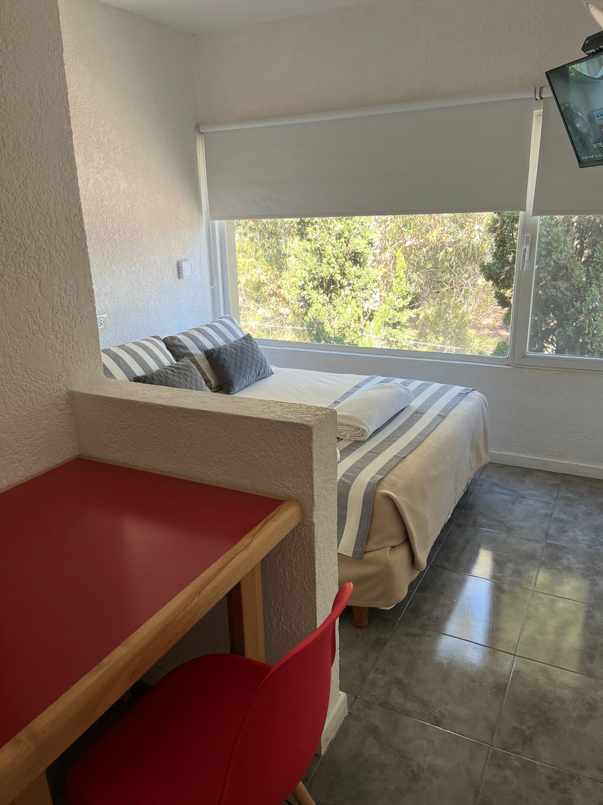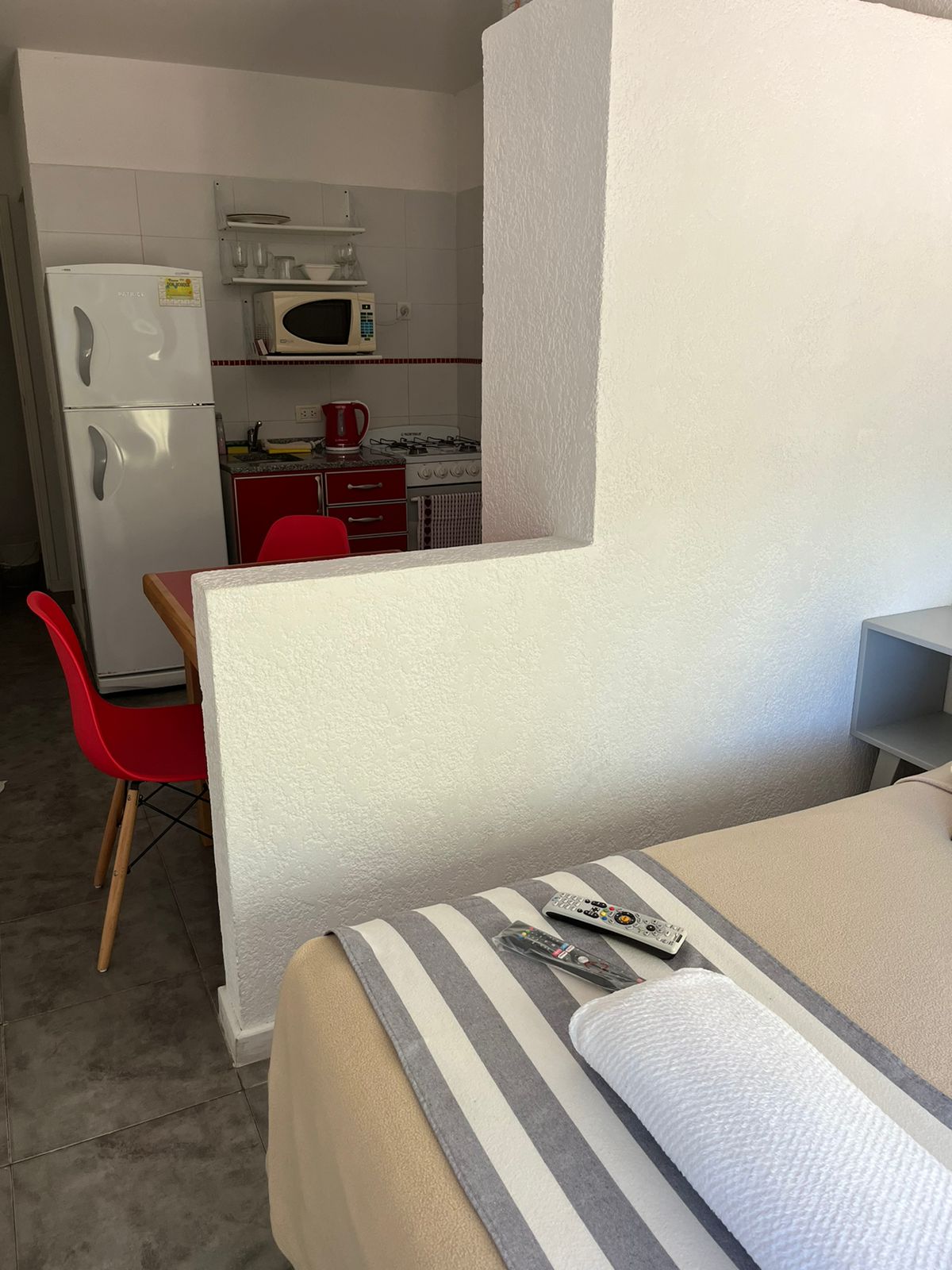 Estudio doble básica con somier matrimonialDetalle: monoambiente integrado para dos personas con somier matrimonialTv – Directv wifi – Cocina – Heladera con freezer – microondas – Tostadora pava – eléctrica – Vajilla